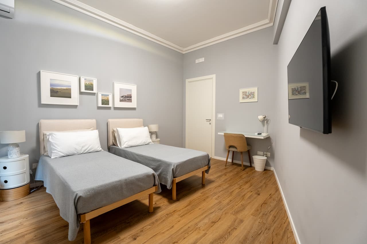 Camera raccolta, confortevole, luminosa e arredata in modo semplice e lineare con colori che trasmettono tranquillità. Fornita di due letti singoli che su richiesta possono essere trasformati in matrimoniale, balcone attrezzato con tavolino e sedie, ampio bagno con doccia walk in ad uso esclusivo. Questa soluzione è l’ideale per le persone in viaggio d’affari o single che per lavoro o per piacere vogliono pernottare a Catania.