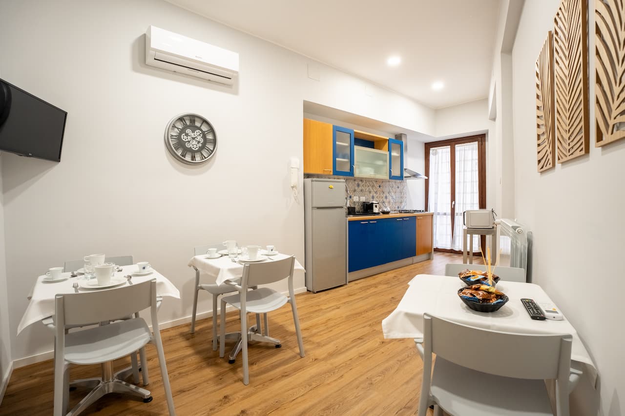 In cucina, si trova tutto l’occorrente che permette di trascorrere anche lunghi periodi lontani da casa senza perdere le buone abitudini. Oltre a piano cottura cappa e frigorifero, troviamo anche macchina del caffè, bollitore, forno a microonde, climatizzatore e TV. Tutto ciò la rende Ideale per gruppi di amici o famiglie per brevi o lunghi periodi.